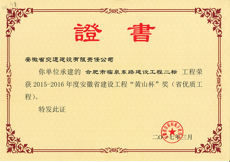安徽省建設工程“黃山杯”獎是安徽省建筑行業(yè)建設工程質量的最高榮譽獎,黃山杯的評選對象為安徽省建筑施工企業(yè)在中國境內承包、已經建成并投入使用的各類工程,工程質量標準需達到省內一流水平。安徽交建自成立以來,積極調整發(fā)展思路,不斷加快市場開拓步伐,重點強化項目管理全過程控制,做好工程進度、質量、安全和現場文明施工管理,營造了良好的企業(yè)形象。