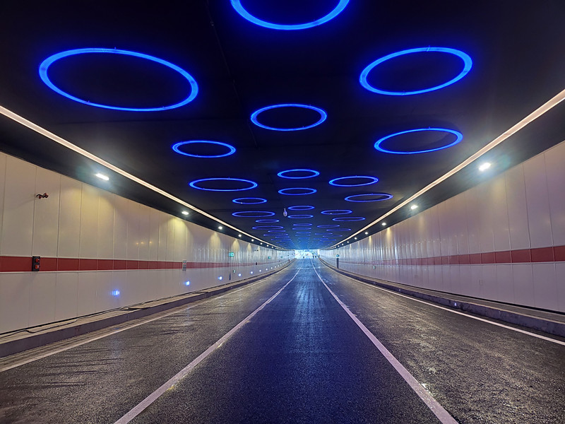 在隧道裝修方面,入口設(shè)置形如天鵝展翅遮光棚,改善進(jìn)出隧道行車視線;隧道內(nèi)白墻黑頂,紅色腰線伸向遠(yuǎn)處,內(nèi)頂鑲嵌圓形LED燈飾,如湖底映射的一個個藍(lán)色漣漪。